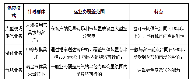表(biǎo) 工業氣體(tǐ)供貨方式(shì)的特性